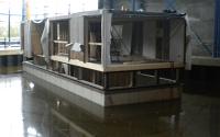 Om plaats te maken voor de bouw van een volgende woonboot werd er water in het dok gelaten en kon de constructie al drijvend worden verplaatst.