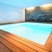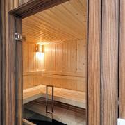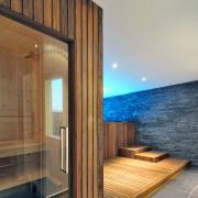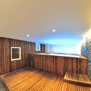 De spa wellness heeft een zwembad met tegenstroom, sauna, badkamer met douche en apart toilet. De gebruikte materialen zijn hardhout, natuurstenen strips aan de wand en keramische wand- en vloertegels.