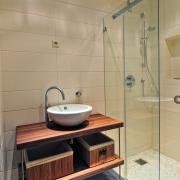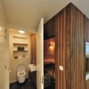 Het bestaande kelderraam is onderdeel geworden van het ontwerp en vormt samen met het nieuwe saunaraam een speelse compositie. De houten bekleding en het natuursteen zorgen voor een mooi contrast met het lichtere tegelwerk en stucplafond.