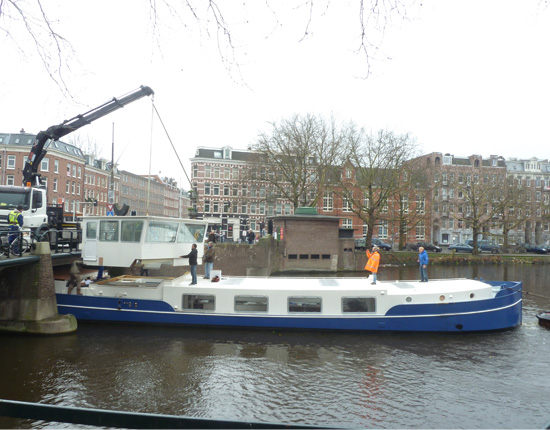 Na de oversteek van het IJ moest de demontabele stuurhut eraf worden gehaald. Dit vanwege de lage vaste bruggen op de route. Terwijl het woonschip verder versleept werd, bracht een vrachtwagen de stuurhut over de weg naar de laatste brug. De vaarroute vervolgde zich over de Amsterdamse grachten met haar historische panden, oude bruggen en fraaie woonboten.