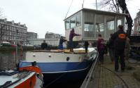 Het woonschip werd van de plaats van afbouw (NDSM-werf) versleept naar de eindelijke ligplaats in het centrum van Amsterdam.