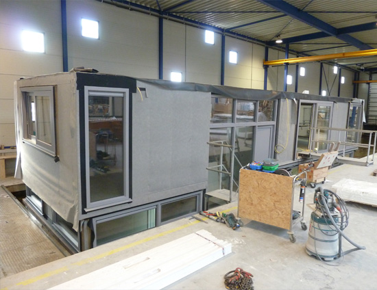 Om plaats te maken voor de bouw van een volgende woonboot werd er water in het dok gelaten en kon de constructie al drijvend worden verplaatst.