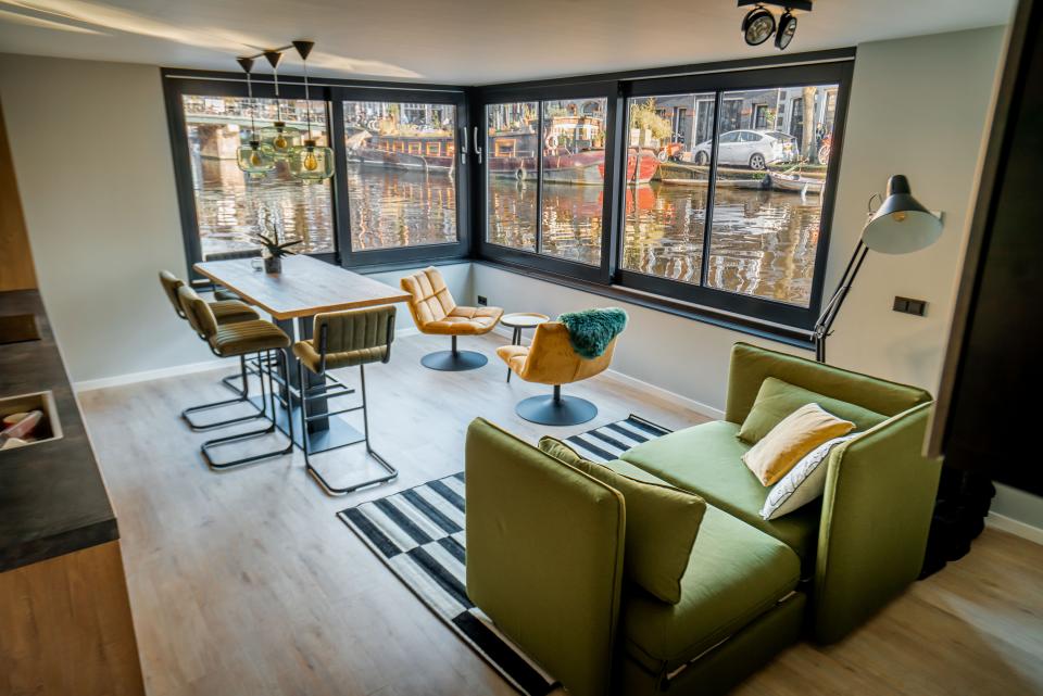 De waterzijde met zicht op de Westertoren is zo open mogelijk. Vanaf je stoel voelt het alsof je in het water zit. De andere zijde met het lawaai van de straat is gesloten. Goede isolatie voorkomt energieverbruik en zorgt ook voor geluidsisolatie. Om ventilatieroosters te voorkomen is op deze rumoerige locatie akoestische muurisolatie gebruikt om woongenot en goede nachtrust te waarborgen.